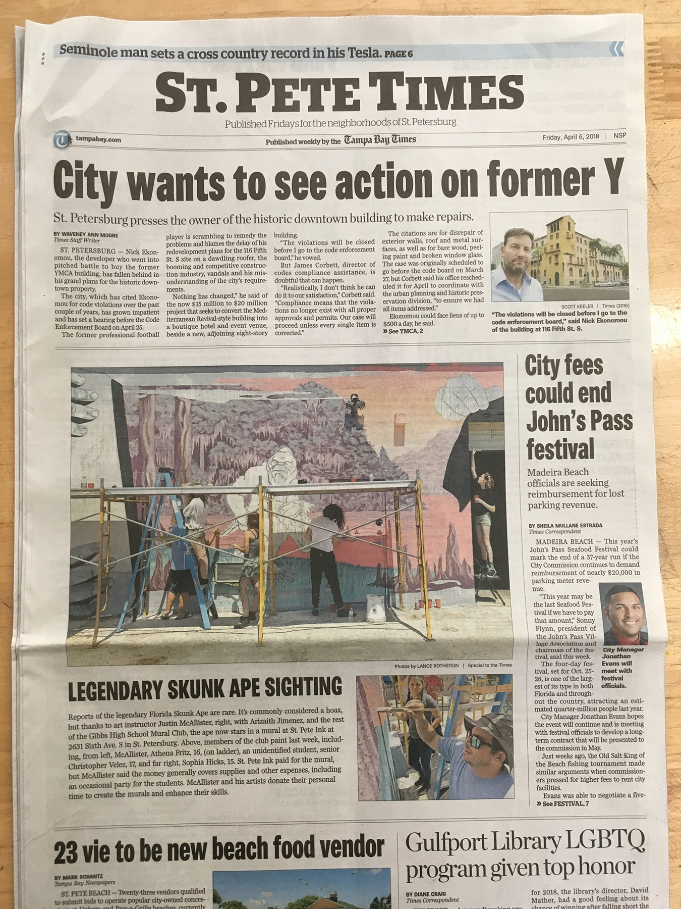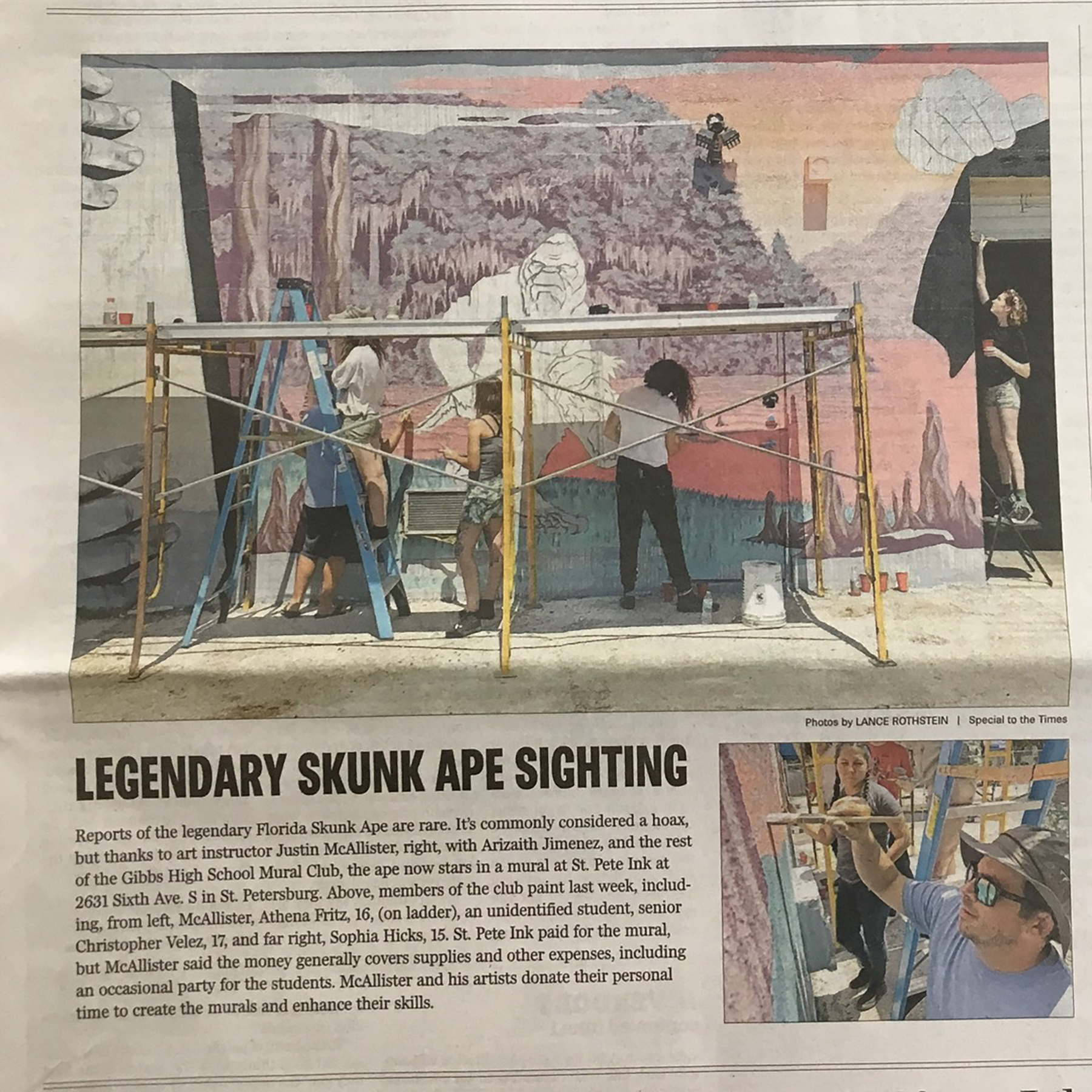 Big thanks to Mr. Hise and St Pete ink, the kids of Gibbs Mural Club, and the parents for making this project a huge success. It was a community effort on all fronts. Our hard work was recognized on the cover of the St Pete Times, as well as featured in Spectrum of the Arts by WPDS-TV14. Below are some process shots of everyone working together to bring you a glimpse of the rare Florida Skunk Ape.